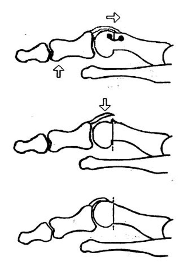 Vervolgens wordt het teenkootje recht gezet en met een draadje of een pennetje vastgezet. Dit pennetje steekt uit de wond en wordt 2 tot 4 weken na de ingreep op de gipskamer verwijderd.