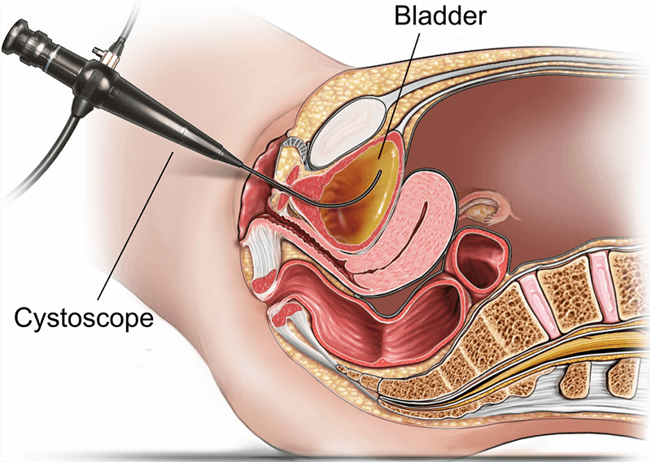 Voor het onderzoek is het nodig dat je met gespreide benen, in speciaal hiertoe ontwikkelde beensteunen, op de onderzoekstafel ligt. Vervolgens wordt de penis of schede gereinigd met een desinfecteervloeistof. In de plasbuis wordt vervolgens wat gelei gespoten. Deze gelei dient als glijmiddel en als verdovingsmiddel van het slijmvlies, zodat eventuele pijn tot een minimum wordt beperkt. Probeer je zo goed mogelijke te ontspannen, zodat het inbrengen van de cystoscoop zo gemakkelijk mogelijk gaat. De specialist brengt de cystoscoop via (de opening van) de plasbuis in de blaas. Via een slangetje dat aan de cystoscoop verbonden is met een zak spoelvloeistof wordt er steriel water in de blaas gebracht.