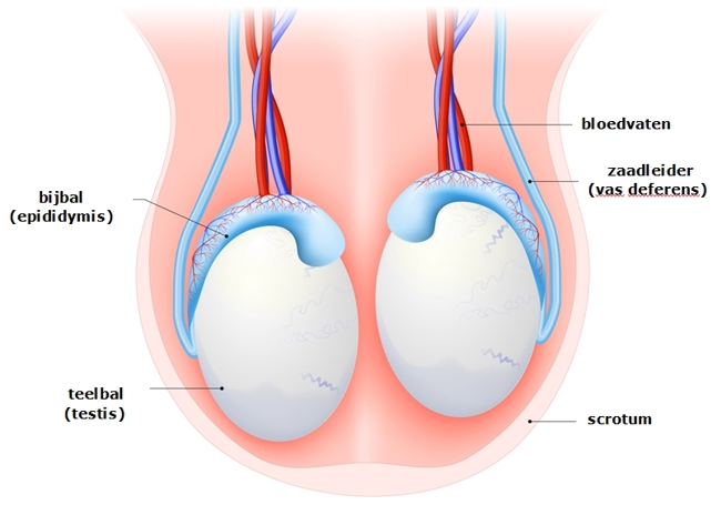 In de teelbal worden zaadcellen gemaakt. In de bijbal groeien deze verder. Als de zaadcellen klaar zijn, gaan ze via de zaadleider naar de prostaat. De prostaat maakt vocht dat samen met de zaadcellen sperma vormt. Bij een zaadlozing komen de zaadcellen samen met dit vocht via de plasbuis naar buiten.