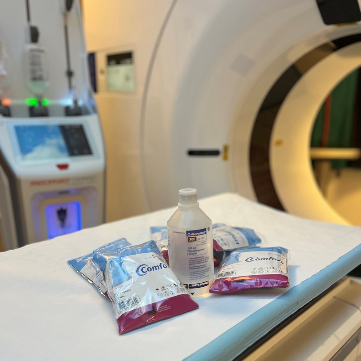 Bij veel CT-scans krijg je contrastmiddel ingespoten. Dit middel maakt je organen en bloedvaten beter zichtbaar in de scan. Na het onderzoek plas je dit contrastmiddel uit. Het middel is heel lastig uit het rioolwater te halen en dat is slecht voor het milieu. Daarom vragen we patiënten om na de CT-scan 4 keer in een plaszak te plassen.