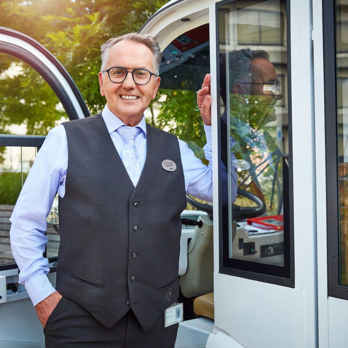 “Sinds een paar jaar hebben we het busje dat mensen van de parkeerplaats naar de ingang brengt en weer terug. Het rijdt af en aan, maar als ik iemand zie die staat te wachten, speciaal als dat iemand is die slecht ter been is, bel ik de chauffeur of hij even vaart kan maken. Busje komt zo! Ik weet nog dat een mevrouw haar auto kwijt was. Toen hebben we meerdere rondjes over de parkeerplaats gereden, net zolang tot we haar auto hoorden piepen. Dat zijn komische momenten.”
